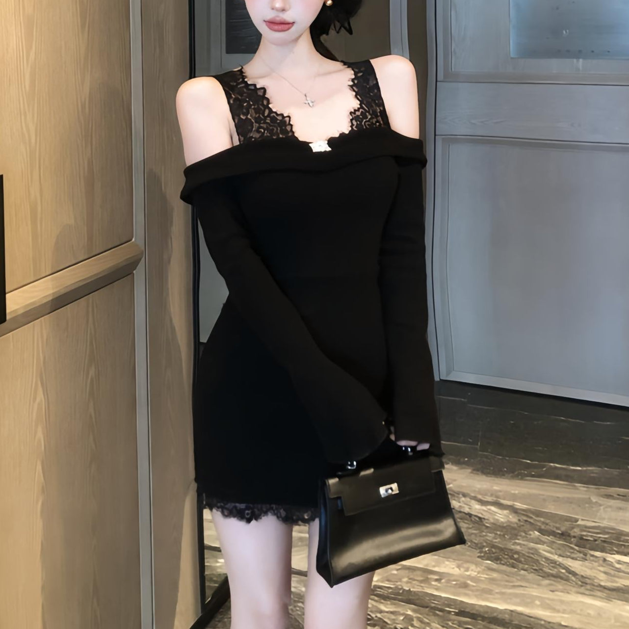・裾とショルダー部分にレースがついていてレイヤード風になったデザインです。